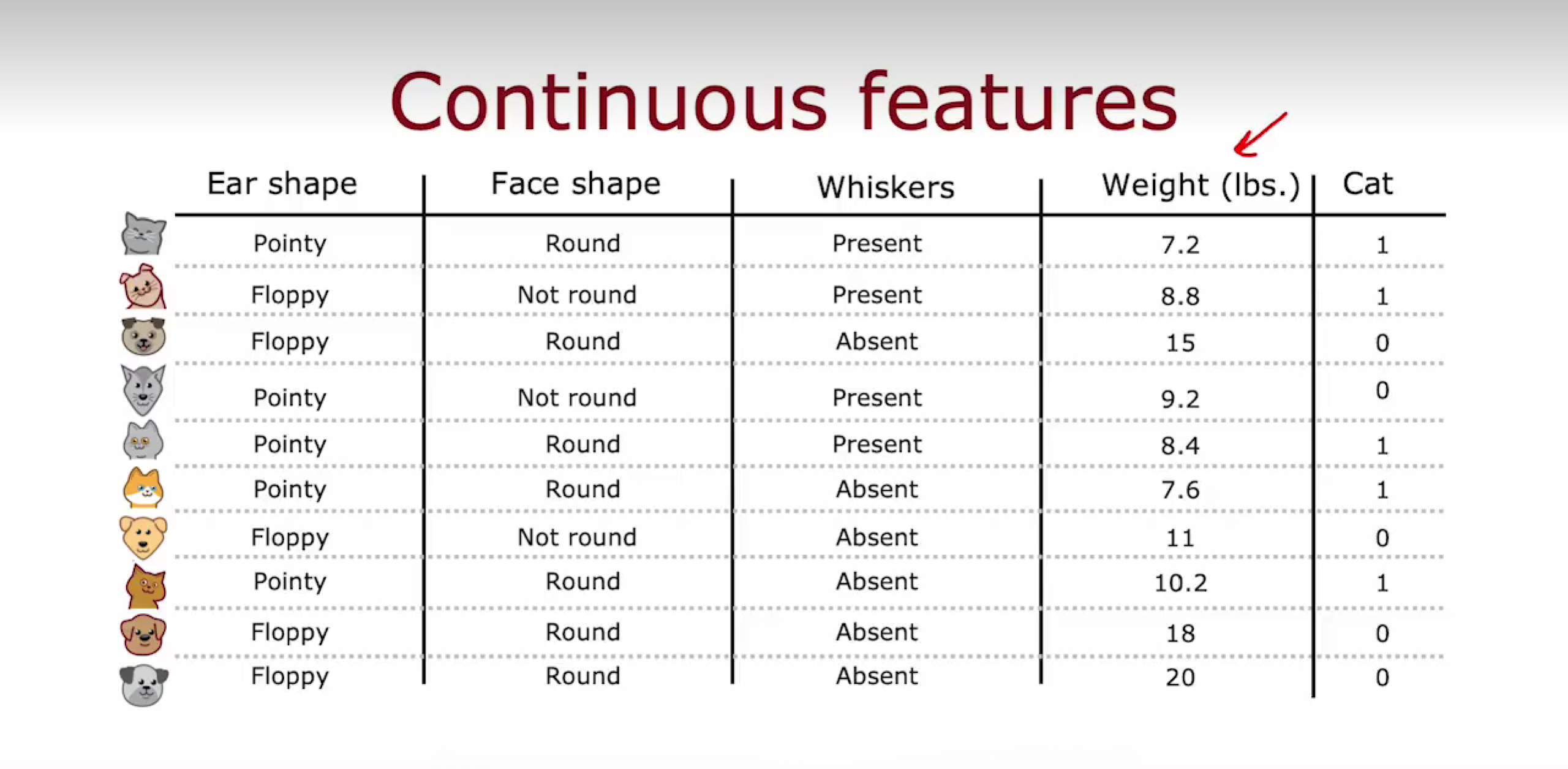 依旧以猫分类模型为例,加入我们现在有一个新的特征:体重,那么我们该如何以体重作为特征值来分裂结点呢?