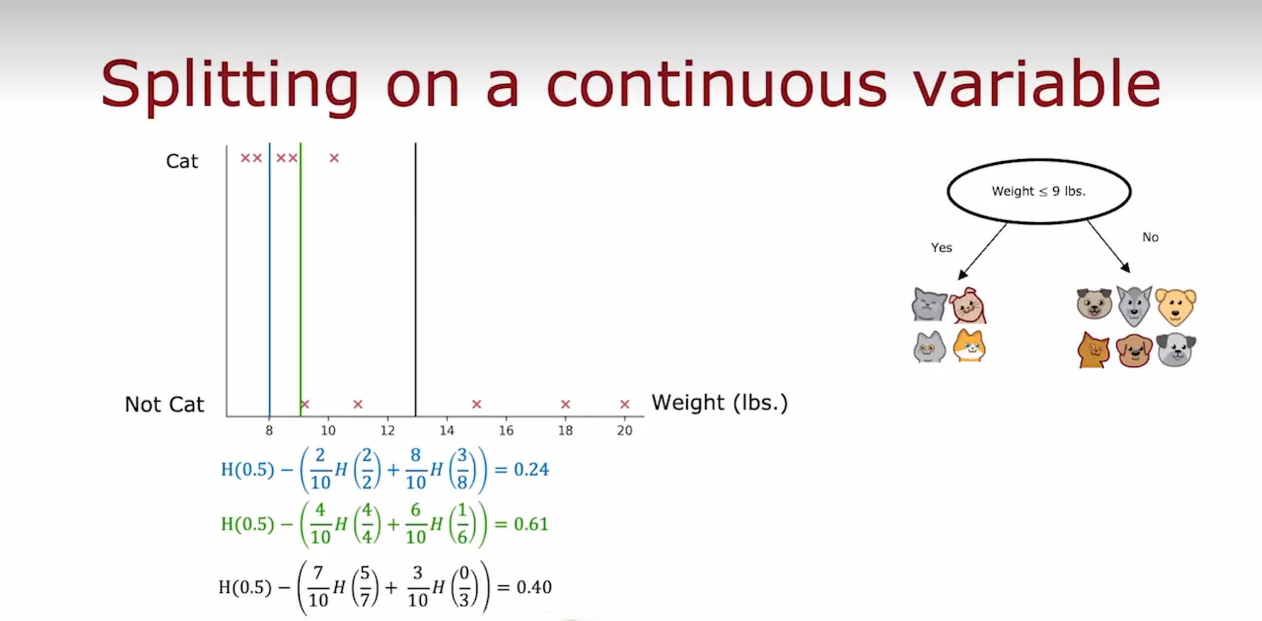 比如当我们划定阈值为8时,那么判定为猫的数量为2,非猫的数量为8,所以信息增量计算为,然后我们可以再将阈值设置为9进行计算,之后我们可以再将阈值设置为其他值进行计算,最终通过比较,阈值为9的时候信息增益最高,所以我们就可以选择9作为体重的阈值,然后按该阈值来分裂结点。