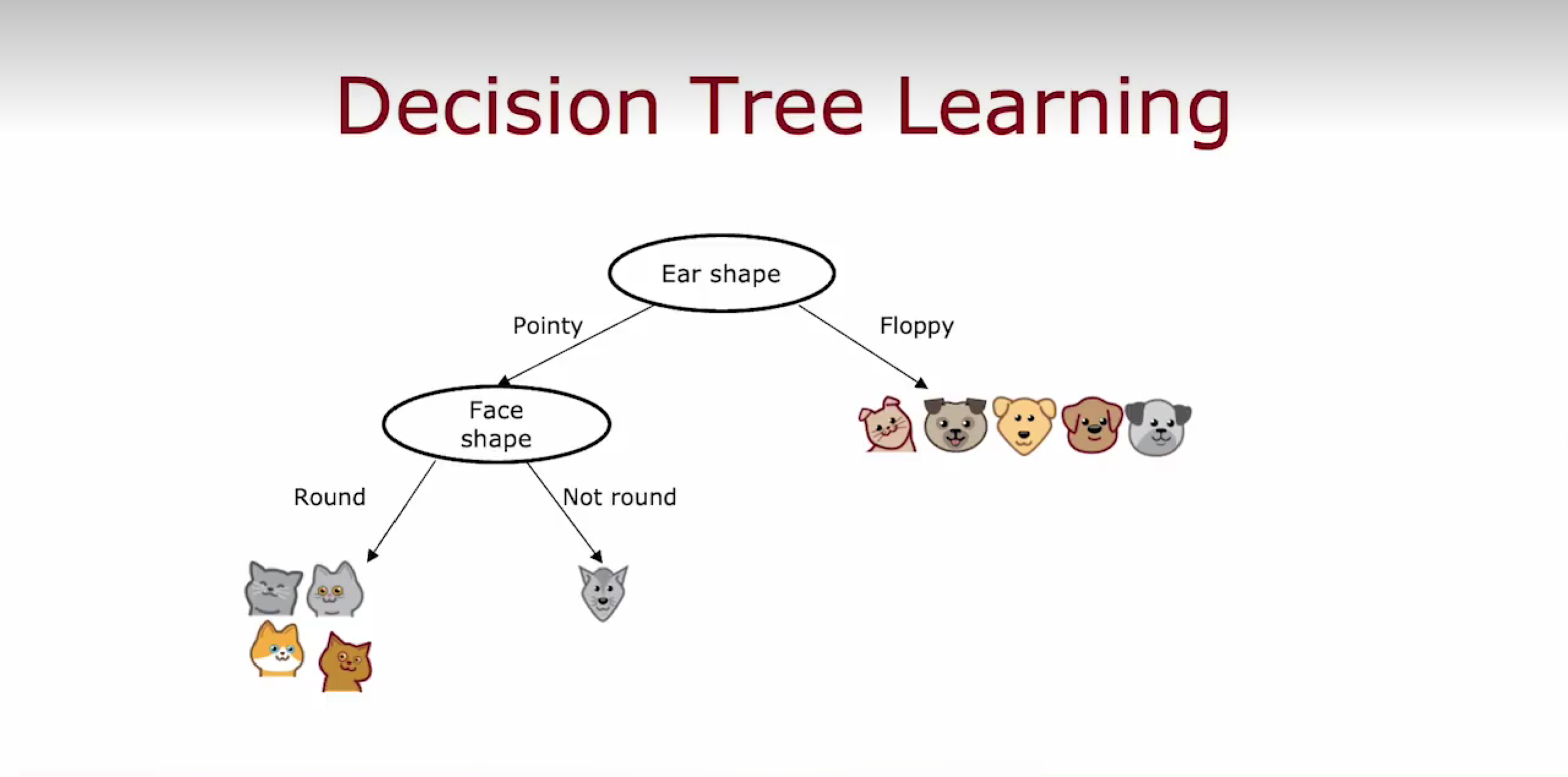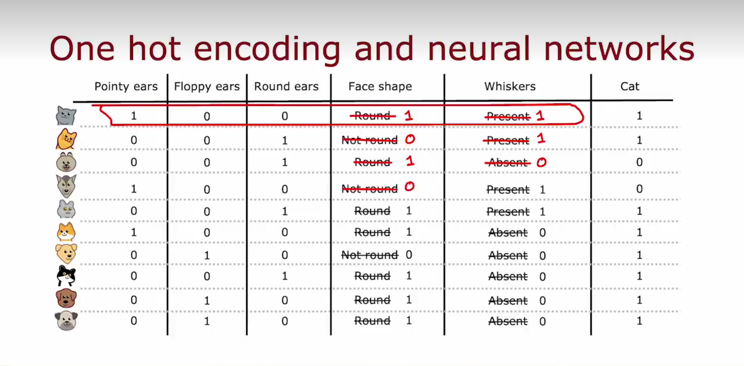 那么通过one-hot编码,我们就可以将其分解为三个特征:有无尖耳、有无圆耳和有无椭圆耳,这样就有变成了之前所学的决策树模型。