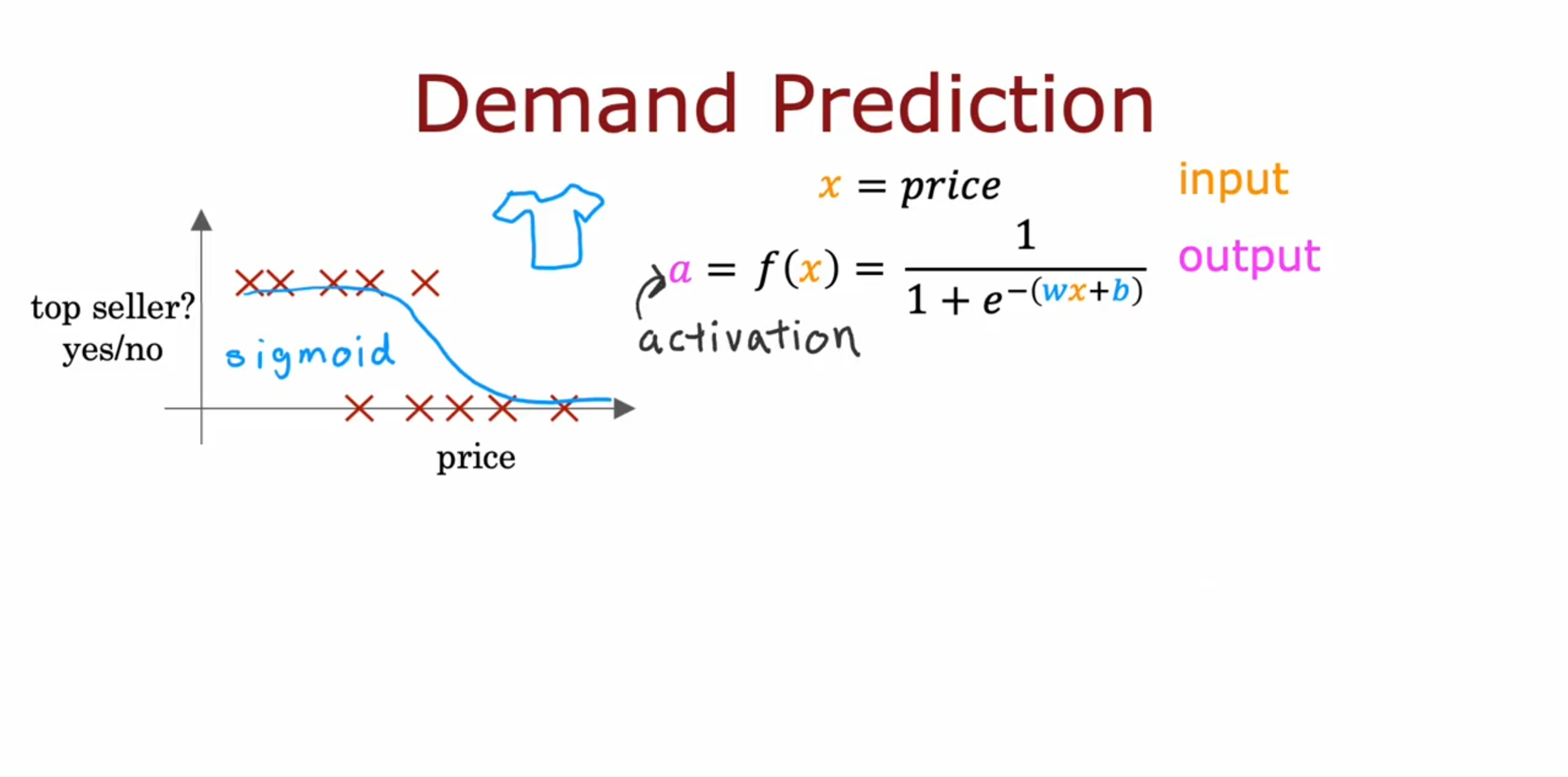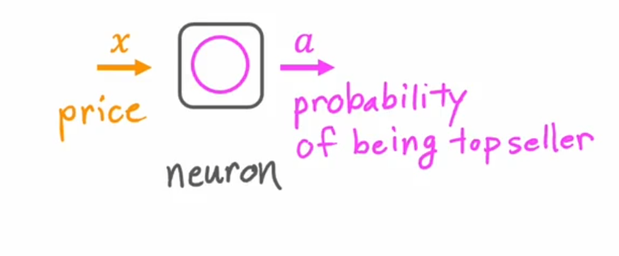 我们的输入是衣服的价格,输出则是由sigmoid函数得到的畅销概率,我们将记为,现在我们可以将这个单个的逻辑单元视为神经网络中的一个神经元,它的输入是衣服的价格,输出则是改衣服成为畅销产品的概率。