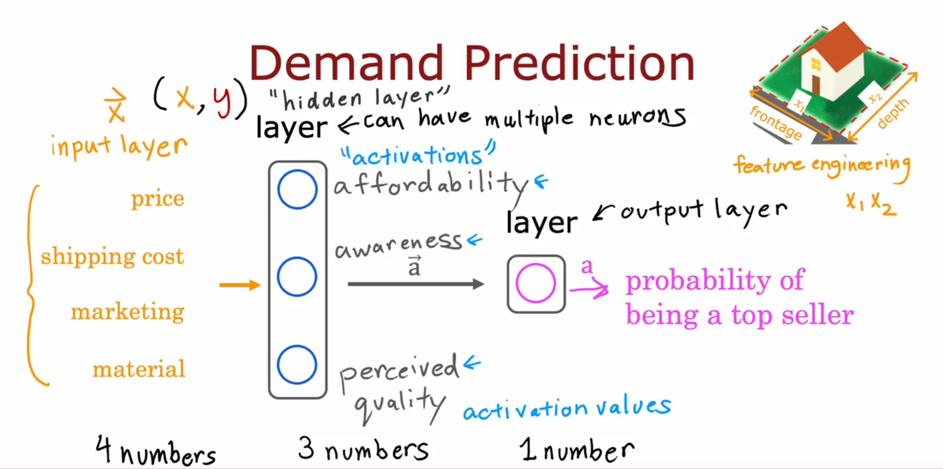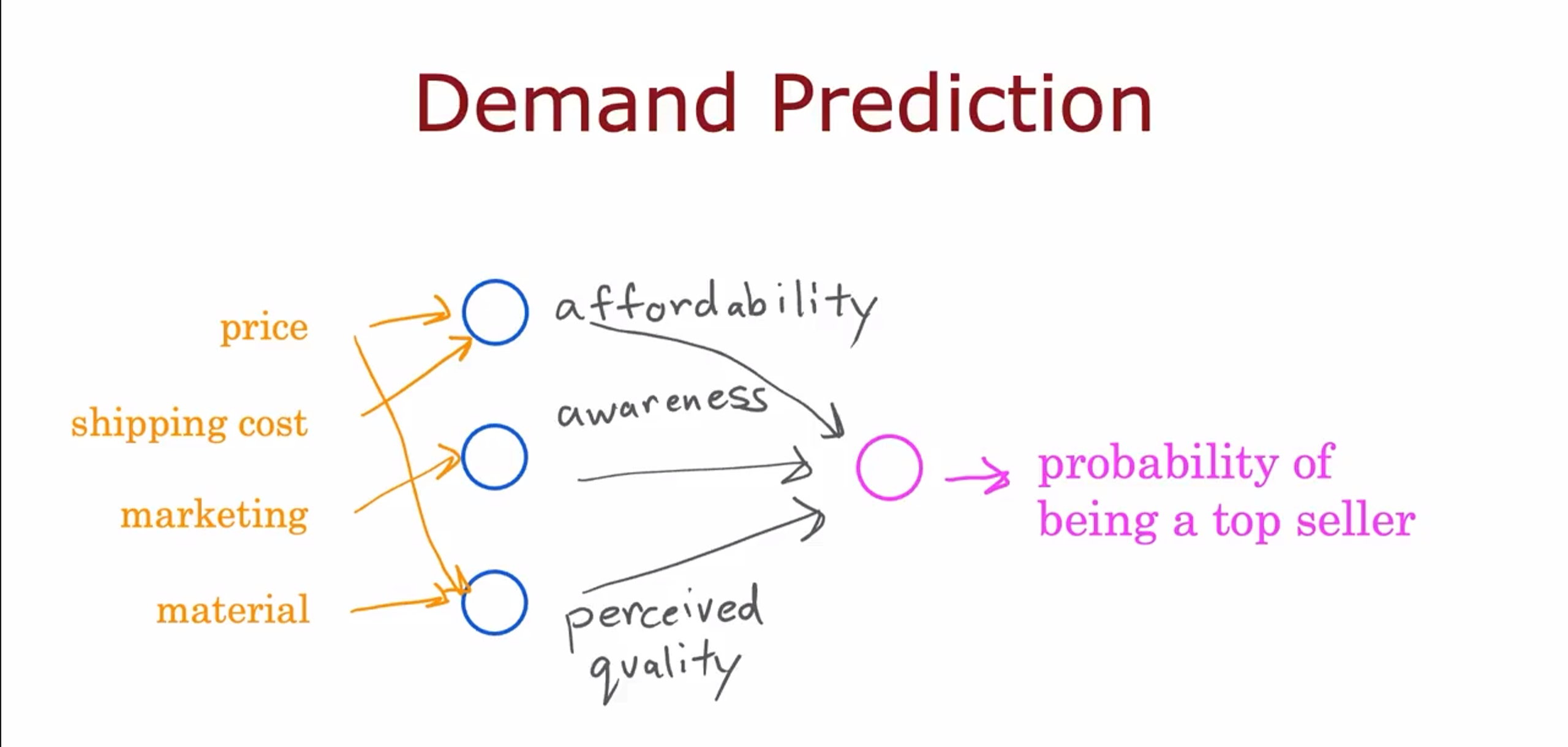 假如我们现在已知四种关于该衣服的参数,分别是:价格、运费、市场营销、材料。现在我们要利用这四个特征来对该种衣服的畅销度进行预测,那么我们首先可能会考虑到影响该件衣服畅销度的几个因素,比如:该衣服的负担能力、衣服的知名度以及该衣服的质量。其中,我们会认为影响负担能力的因素有价格和运费,影响知名度的因素有市场营销,而影响感知质量的因素有价格和衣服的材料。通过对这三个中间因素的分析,我们最后可以评测这件衣服是否能成为畅销品。