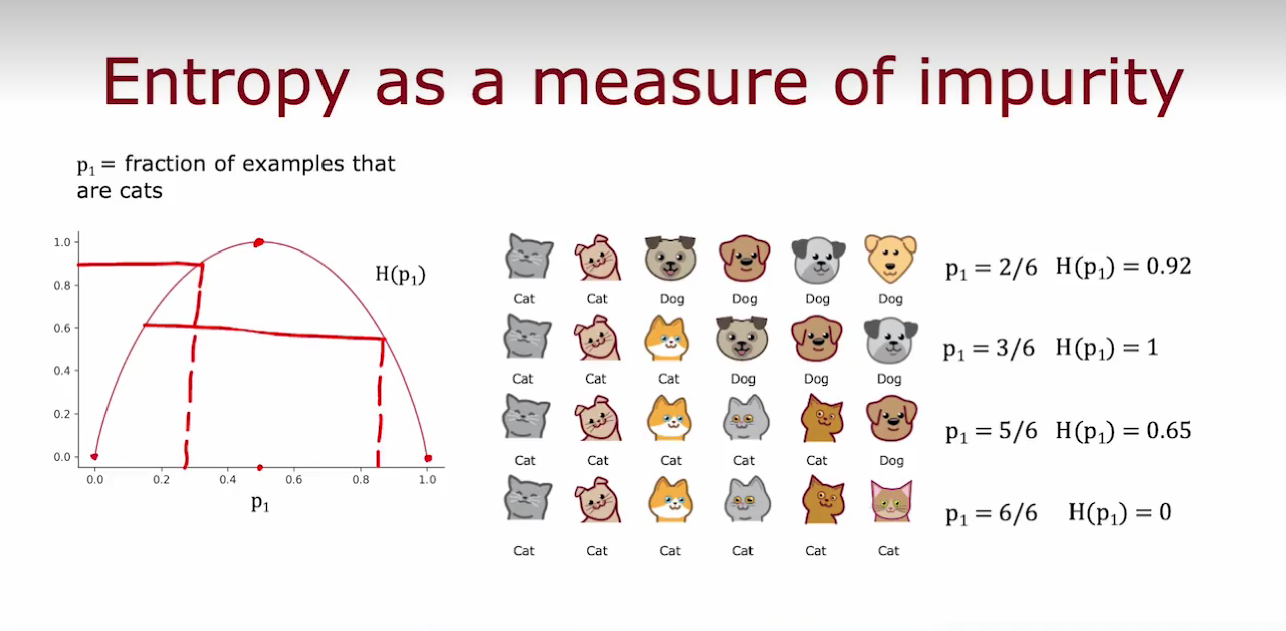 首先我们定义表示所有样本中正类所占的比例,假如现在有6个样本示例,其中3个狗3个猫,那么,熵通常表示为的函数,熵函数关于的曲线大致如下: