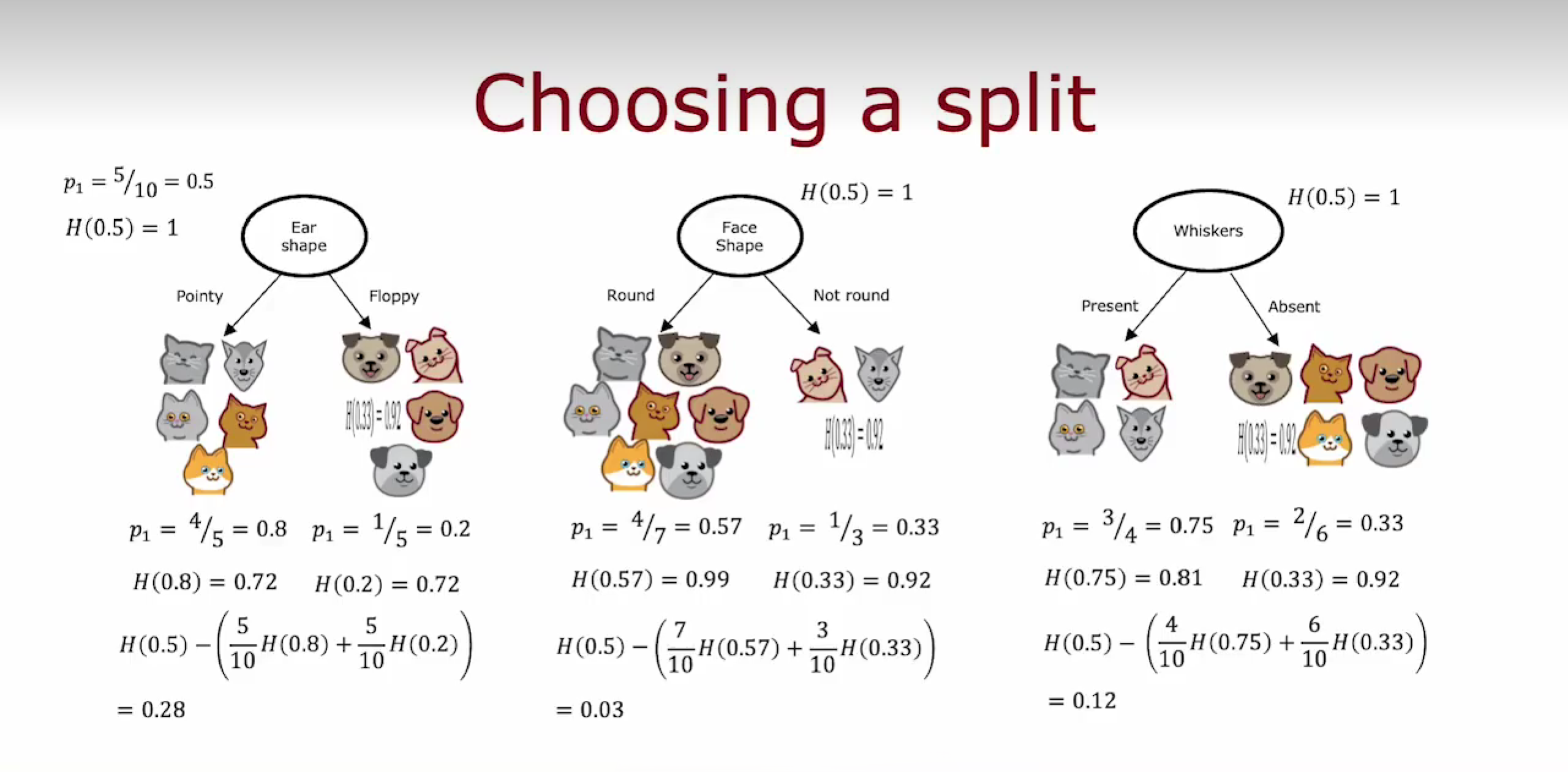 有了熵,我们就可以通过计算熵的变化来确定选择哪个特征作为分裂依据最合适,而信息增益(information gain)可以衡量由于分裂而导致的树中的熵的减少。