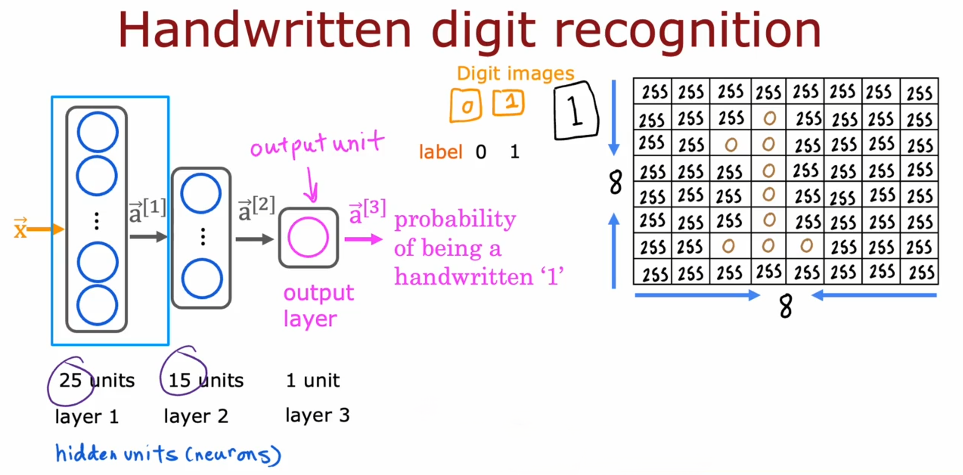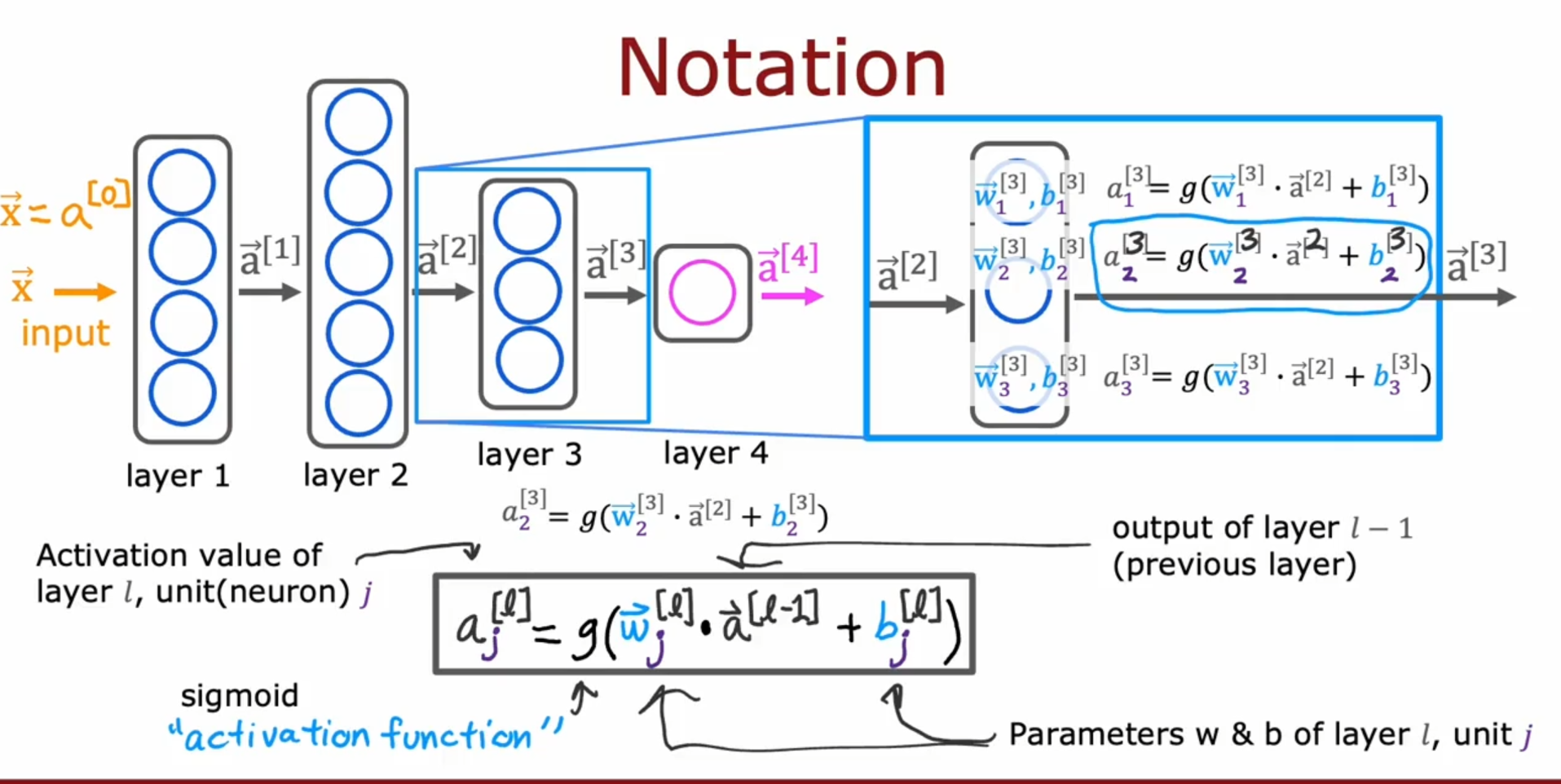 现在有一个神经网络,我们将向量作为输入值输入,在第一层神经网络中进行计算。在第一层中有三个神经元,这三个神经元每一个都可以实现一个小型的逻辑回归单元,每一个神经元都有两个参数:和,它们的作用是输出一些激活值,其中表示sigmoid函数。为了方便我们将第一个神经元的参数以及输出的激活值表示为,以此类推,最终得到该层的输出值。
