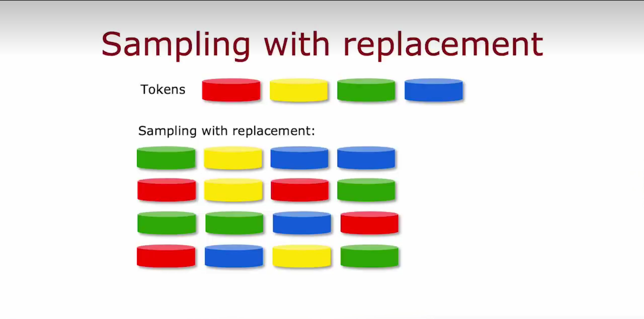 比如现在袋子中有四种颜色的令牌,分别是红黄绿蓝,我们每次抽取一个令牌,一共抽取四次。