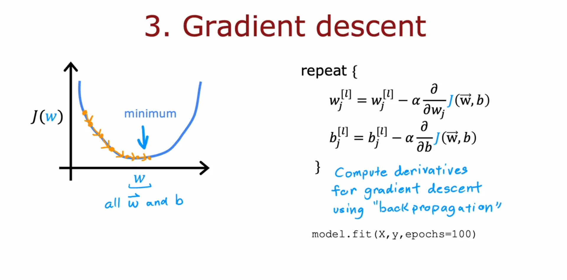 而在tensorflow中,我们可以使用一种名为反向传播的算法来进行计算,在代码中我们只需要调用fit函数即可