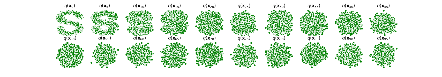 1 2 3 4 5 6 7 8 9 10 11 12 13 14 15 16 num_shows = 20 fig,axs = plt.subplots(2 , 10 , figsize=(28 ,3 )) plt.rc('text' ,color='black' ) for i in range (num_shows): j = i // 10 k = i % 10 q_i = q_x(dataset, torch.tensor([i*num_steps//num_shows])) axs[j,k].scatter(q_i[:,0 ], q_i[:,1 ], color='green' , edgecolor='white' ) axs[j,k].set_axis_off() axs[j,k].set_title('$q(\mathbf{x}_{' +str (i*num_steps//num_shows)+'})$' ) plt.show()