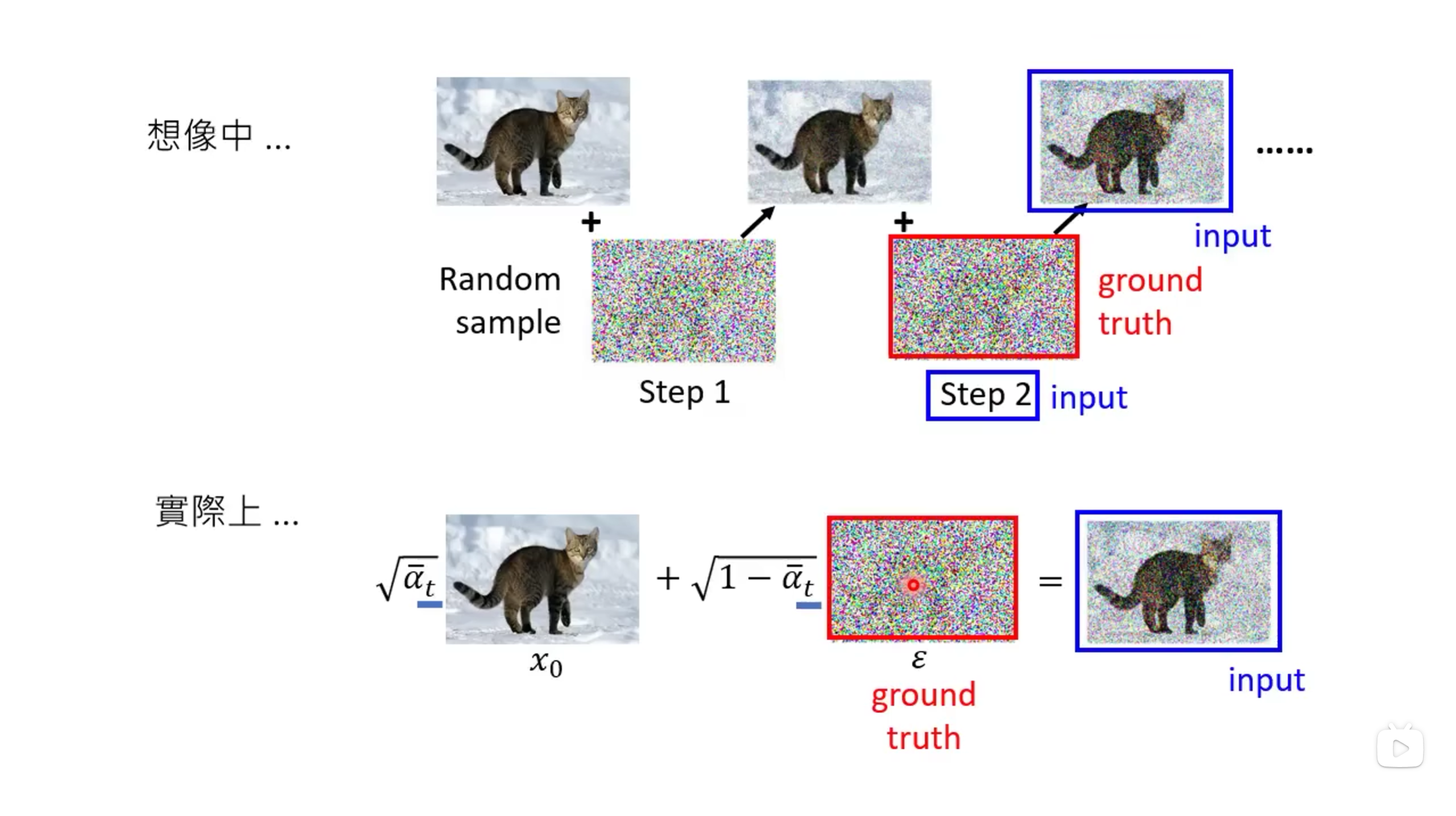 根据上面的公式我们可以发现,想象中我们添加了T T T 次噪声,但实际上我们可以只通过对原图添加一次噪声就得到t t t 时刻的图像。