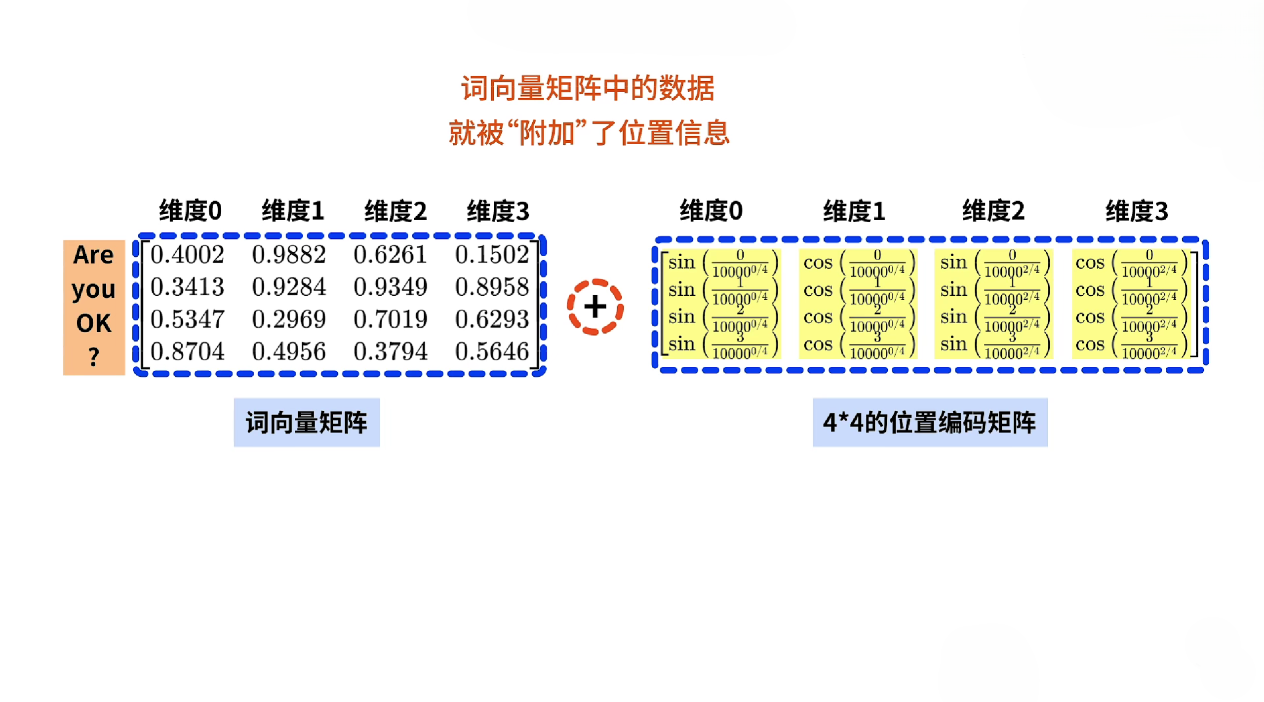 最终我们会将得到的位置编码矩阵与词向量矩阵相加,从而得到嵌入位置编码的词向量矩阵: