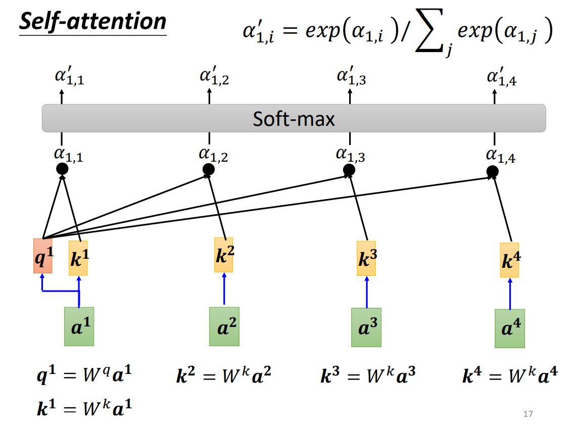 假设我们输入为a 1 , a 2 , a 3 , a 4 a^1,a^2,a^3,a^4 a 1 , a 2 , a 3 , a 4 ,首先我们通过向量W q W^q W q 乘以a 1 a^1 a 1 得到q 1 q^1 q 1 ,也就是我们想得到a 1 a^1 a 1 最后翻译得到的结果query,然后再通过向量W k W^k W k 分别乘以a 1 , a 2 , a 3 , a 4 a^1,a^2,a^3,a^4 a 1 , a 2 , a 3 , a 4 得到k 1 , k 2 , k 3 , k 4 k^1,k^2,k^3,k^4 k 1 , k 2 , k 3 , k 4 ,最后我们使用q 1 q^1 q 1 分别乘以k 2 , k 3 , k 4 k^2,k^3,k^4 k 2 , k 3 , k 4 得到α 1 , 2 , α 1 , 3 , α 1 , 4 \alpha_{1,2},\alpha_{1,3},\alpha_{1,4} α 1 , 2 , α 1 , 3 , α 1 , 4 ,再将其通过一个softmax层就得到了每个输入的注意力分数α 1 , i ′ \alpha_{1,i}' α 1 , i ′ 。