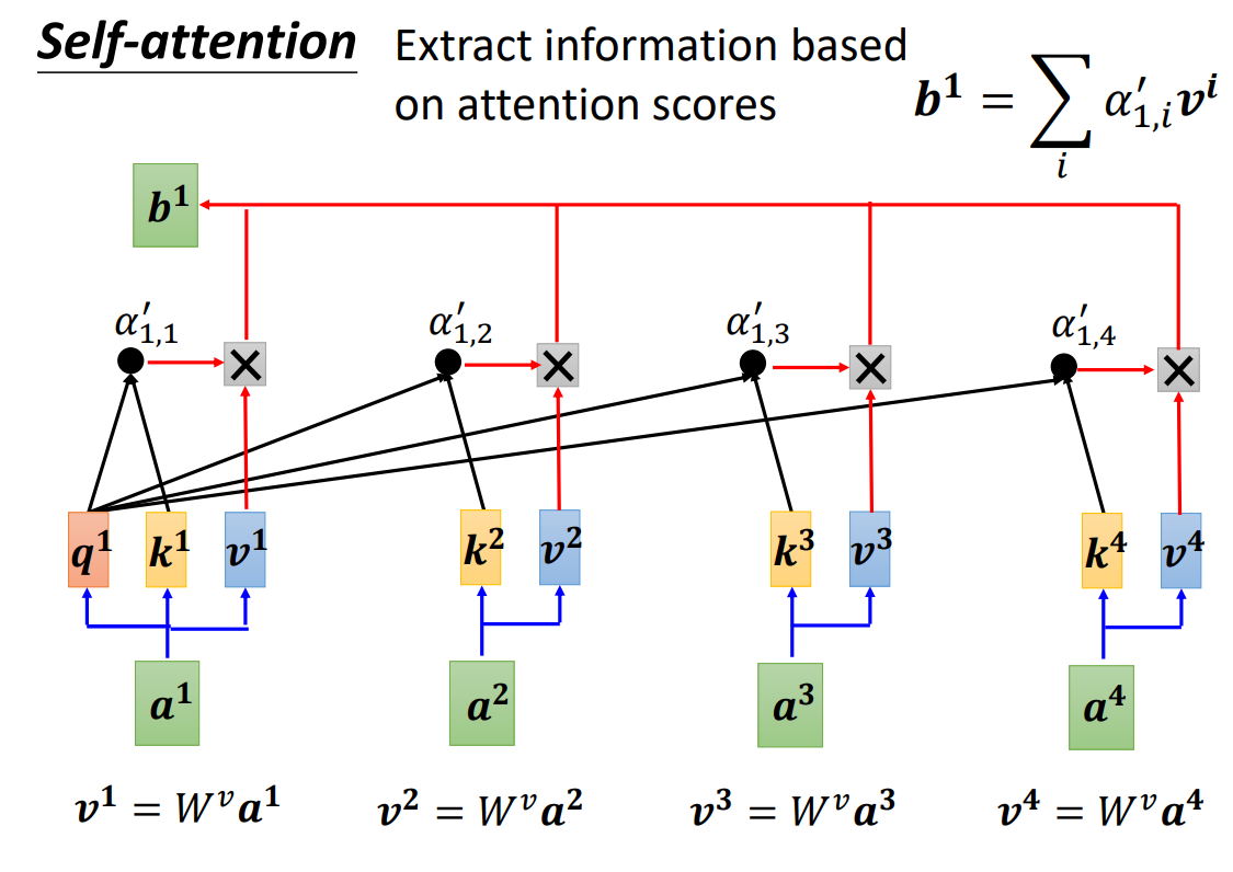 最后的输出b 1 = ∑ i α 1 , i ′ v i b^1 = \sum_i\alpha_{1,i}'v^i b 1 = ∑ i α 1 , i ′ v i ,其中v i = W i a i v^i=W^ia_i v i = W i a i 。其余同理。