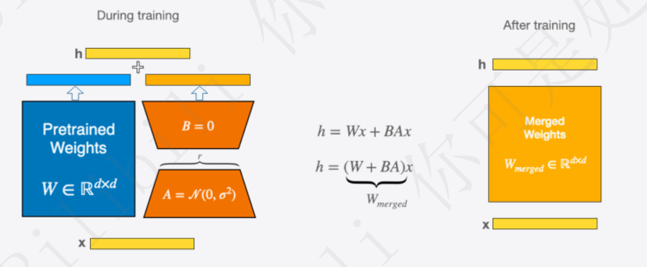- 训练时 仅更新 LoRA 适配器,而不改变原模型参数,减少显存占用和计算量。