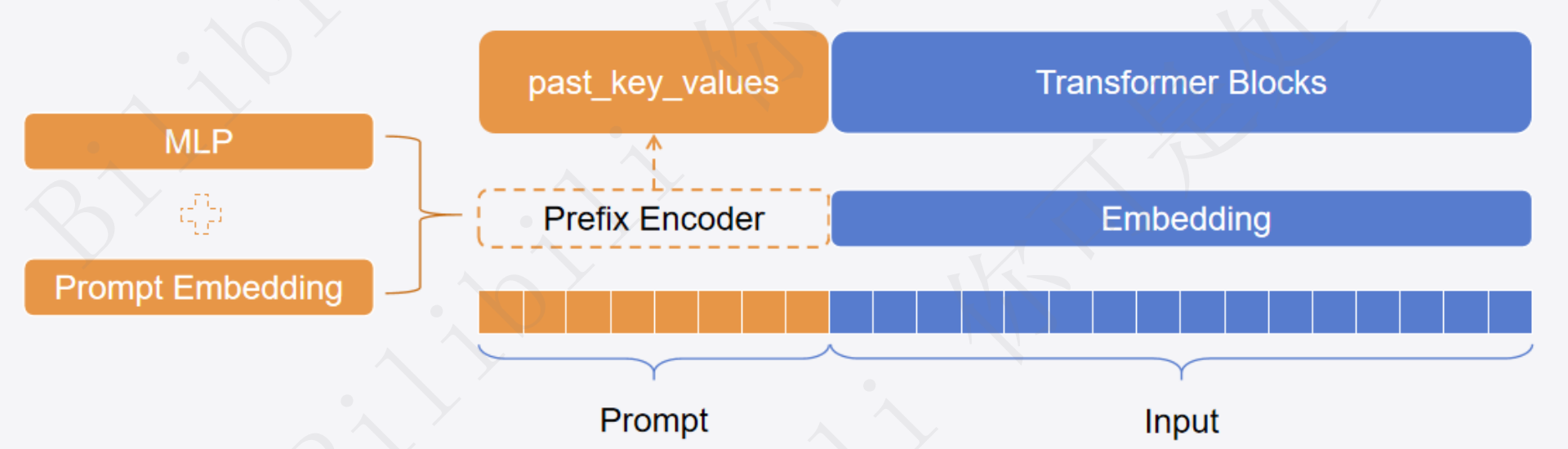 Prefix-Tuning思想:相较于Prompt-Tuning和P-Tuning,Prefix-Tuning不再将Prompt加在输入的Embedding层,而是将其作为可学习的前缀,放置在Transformer模型中的每一层中,具体表现形式为past_key_values