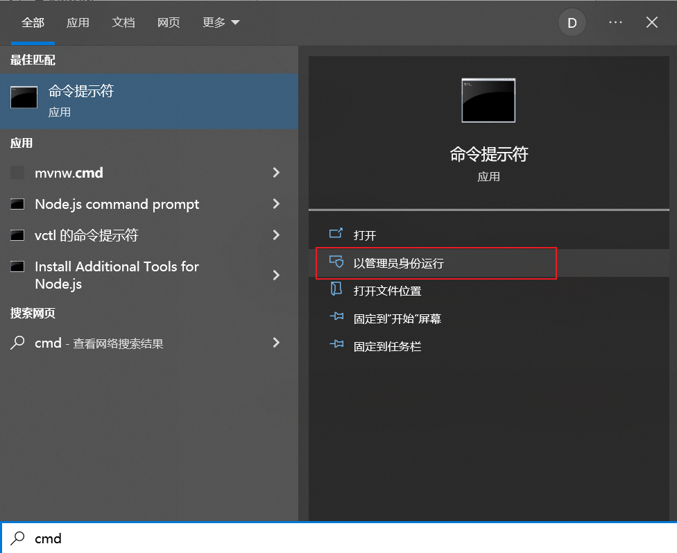 点击开始菜单,输入cmd,选择 “命令提示符”,选择右侧的 “以管理员身份运行”。