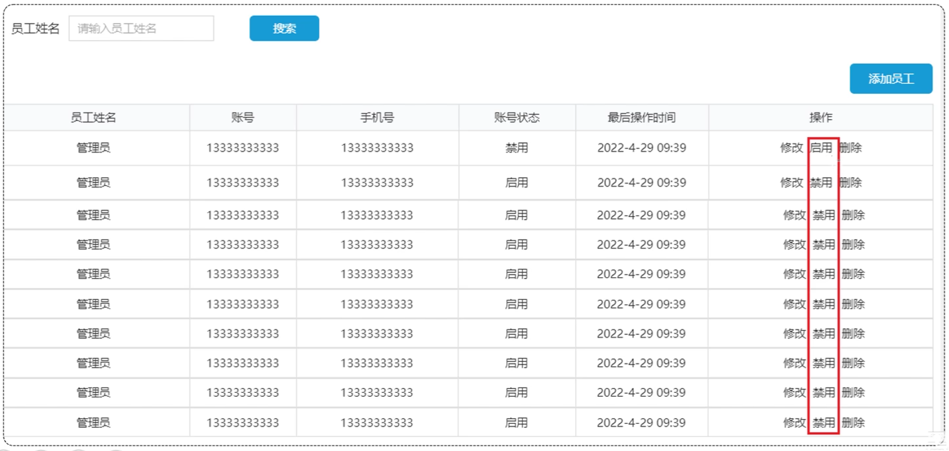- 可以对状态为“启用”的员工账号进行“禁用”操作
