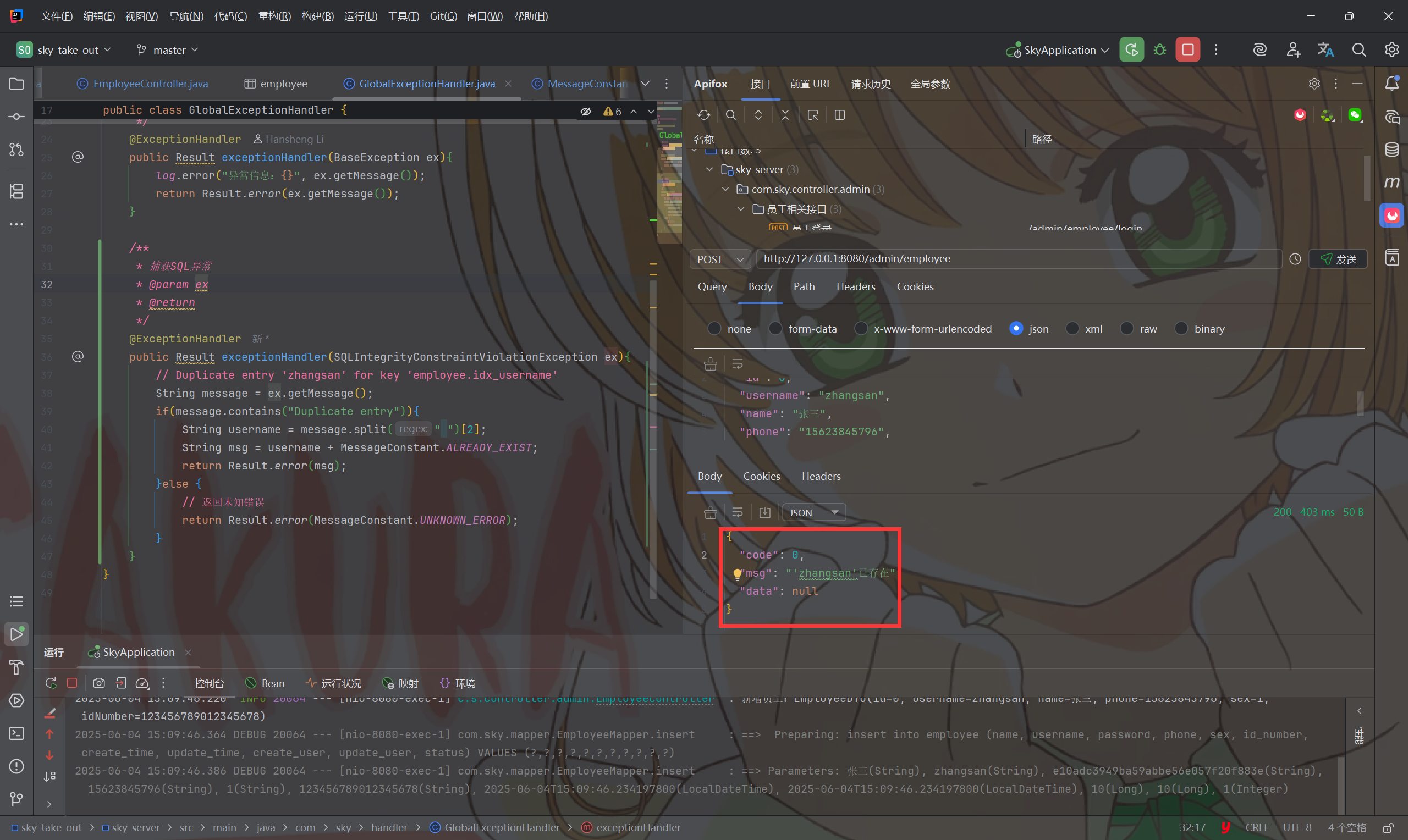 - 问题1:在GlobalExceptionHander中处理异常信息: