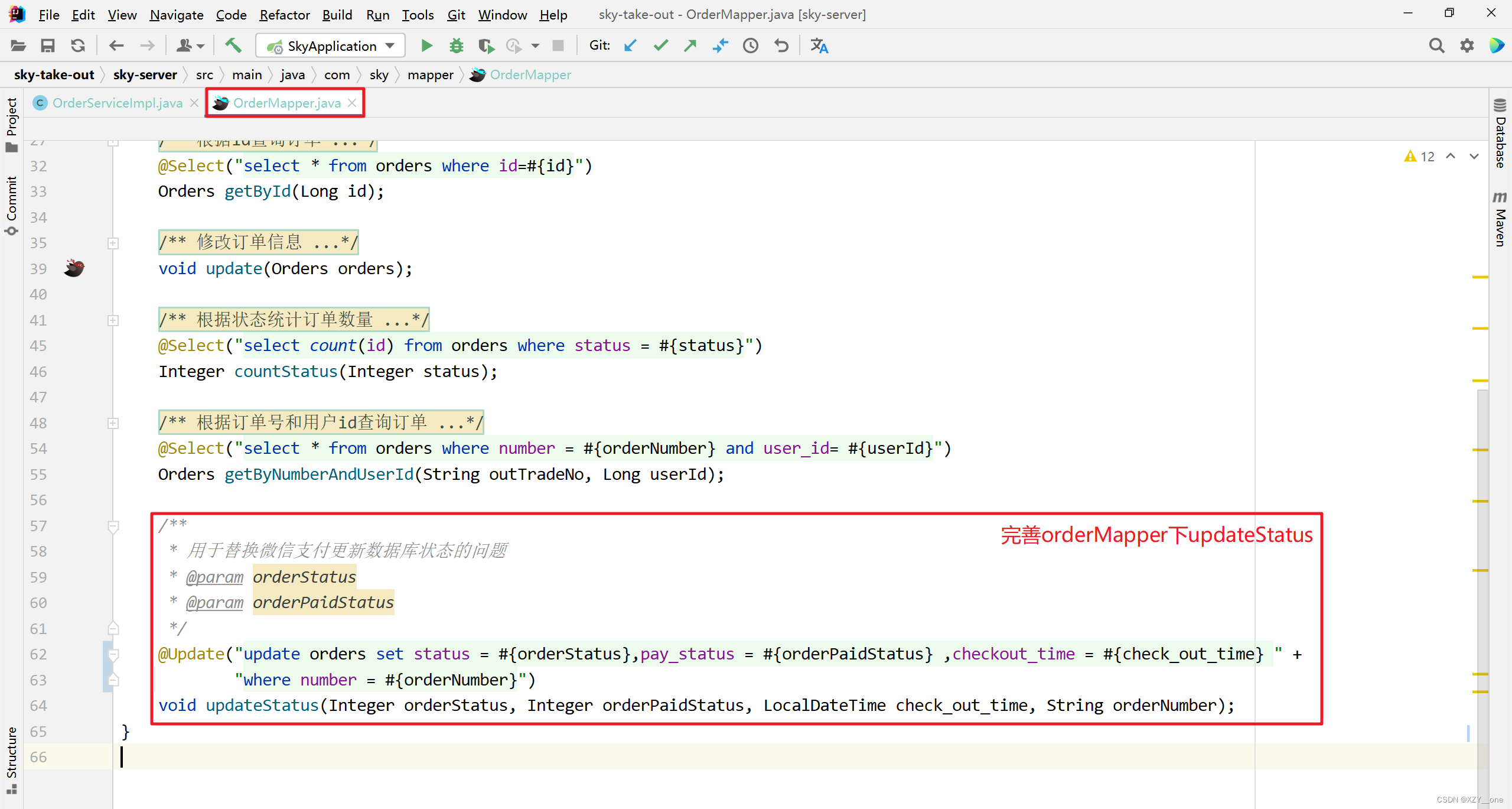 完善这个orderMapper下这个updateStatus方法: