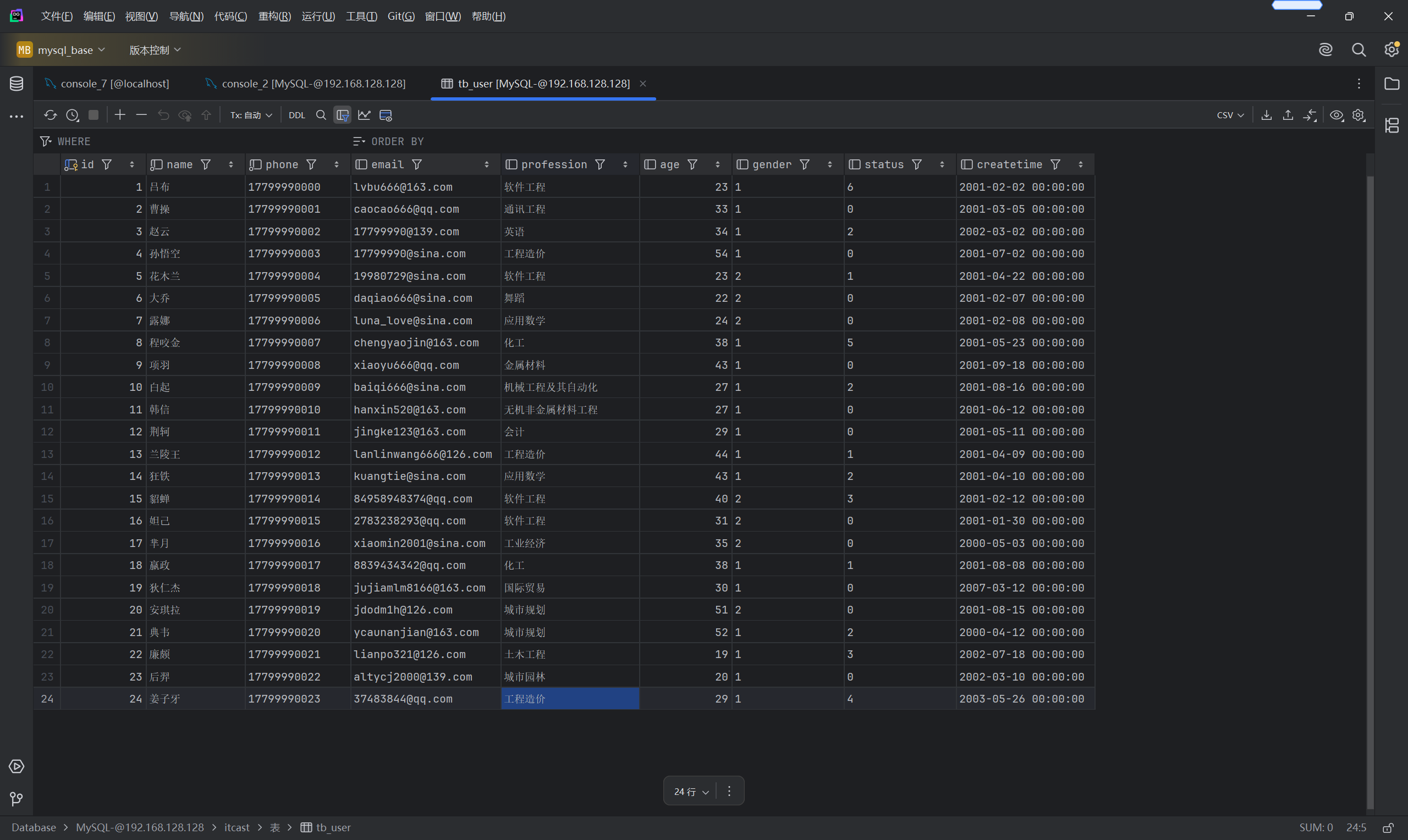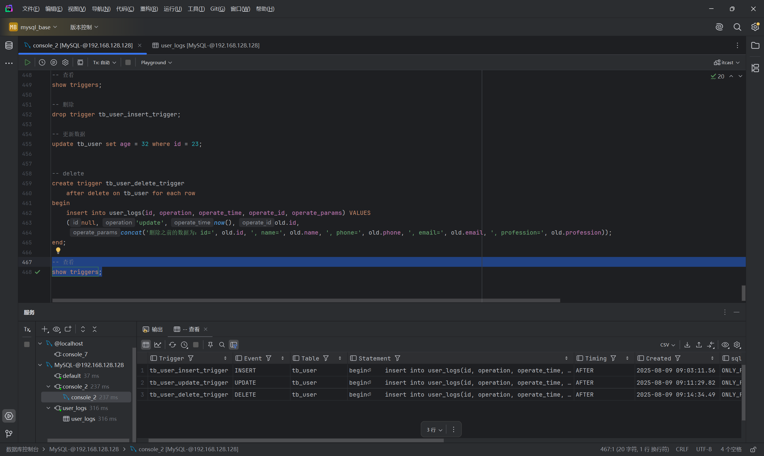 当前读:读取的是记录的最新版本,读取时还要保证其他并发事务不能修改当前记录,会对读取的记录进行加锁。对于我们日常的操作,如:select … lock in share mode(共享锁),select … for update、update、insert、delete(排他锁)都是一种当前读。