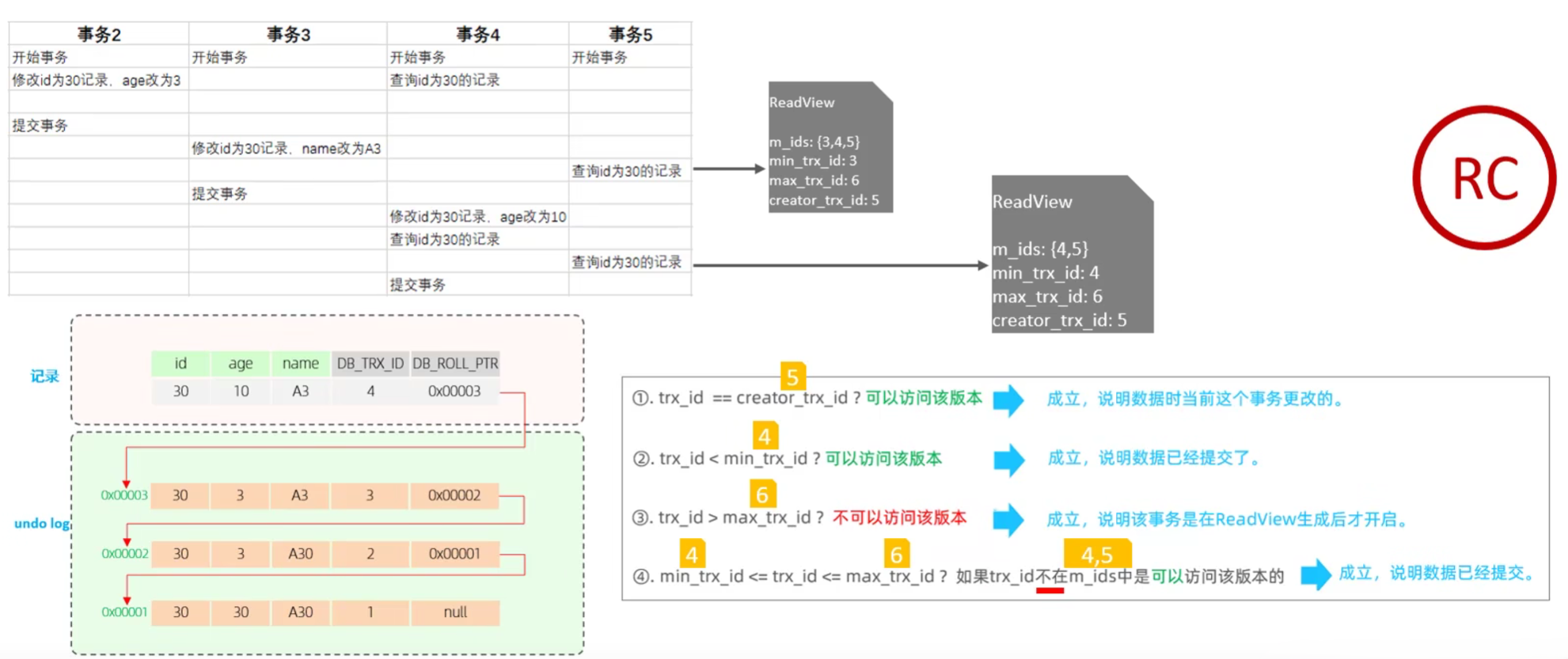 - RC隔离级别下,在事务中每一次执行快照读时生成ReadView。