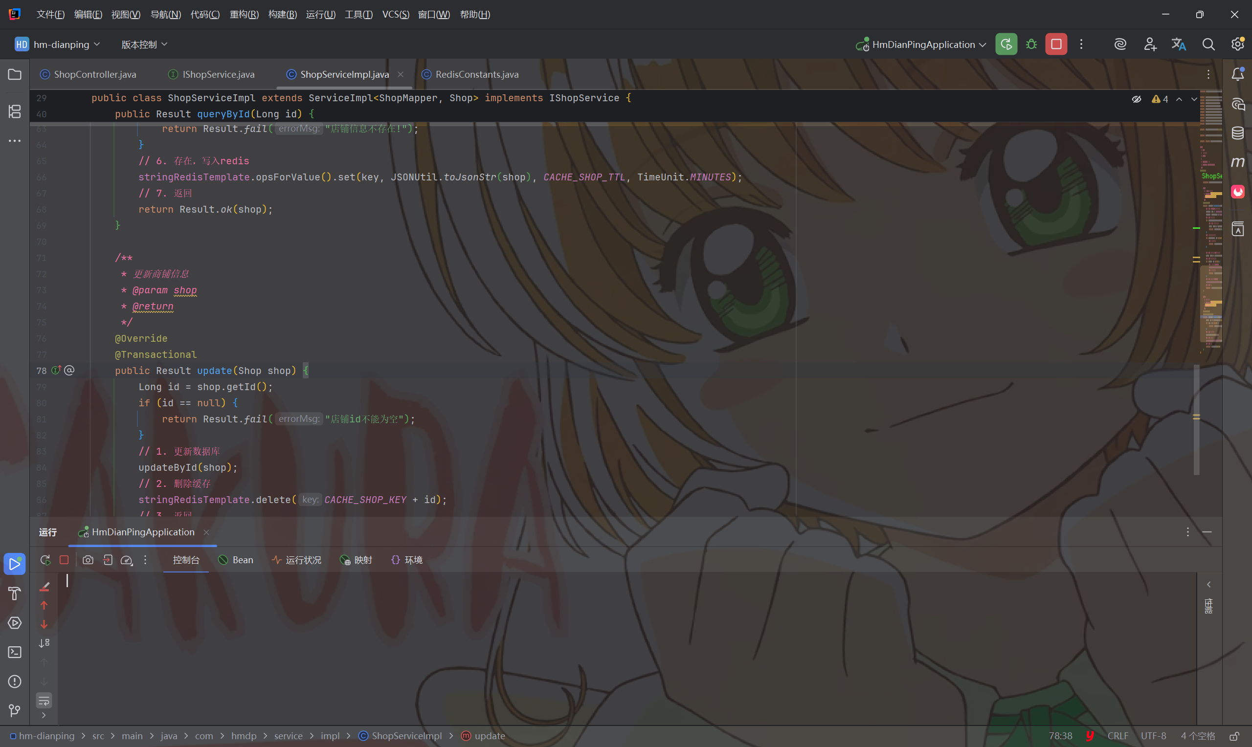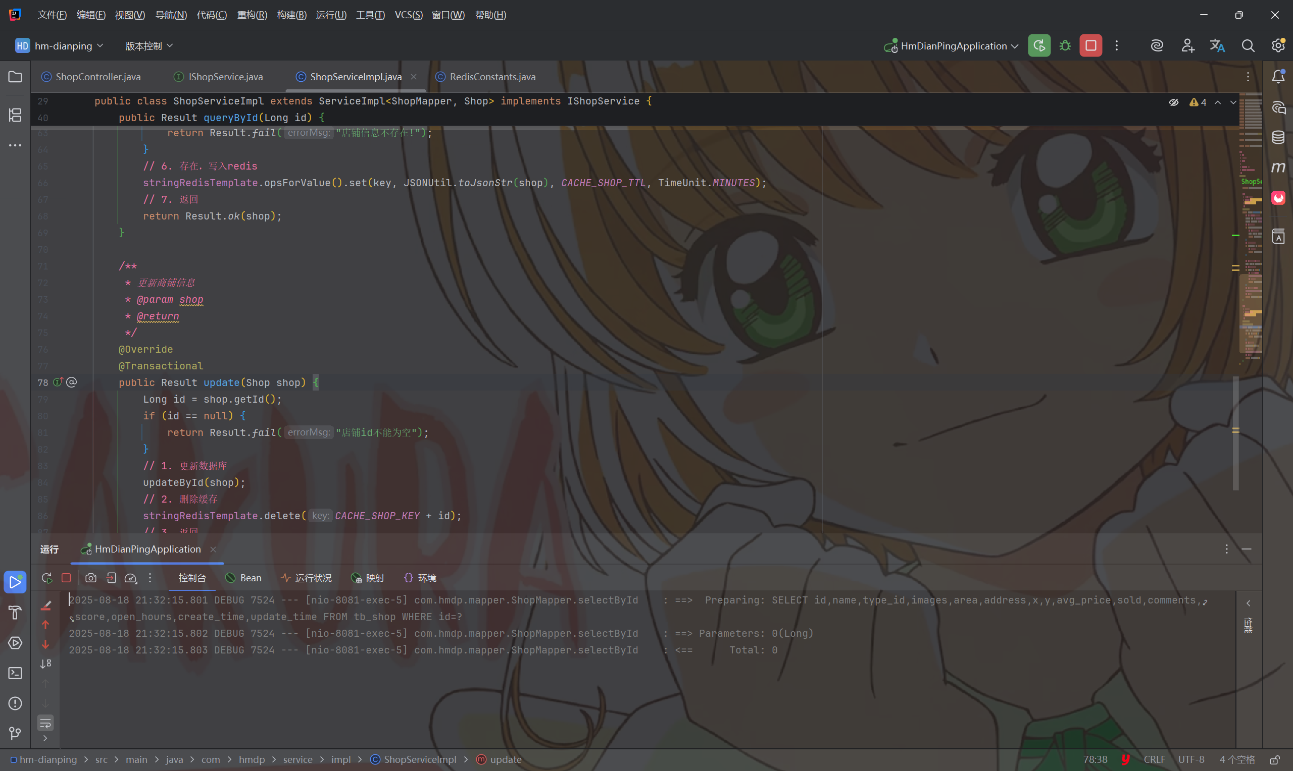 public <R, ID> R queryWithLogicalExpire(String keyPrefix, ID id, Class<R> type, Function<ID, R> dbFallback, Long time, TimeUnit unit) { String key = CACHE_SHOP_KEY + id; String shopJson = stringRedisTemplate.opsForValue().get(key); if (StrUtil.isBlank(shopJson)) { return null; } RedisData redisData = JSONUtil.toBean(shopJson, RedisData.class); R r = JSONUtil.toBean((JSONObject) redisData.getData(), type); LocalDateTime expireTime = redisData.getExpireTime(); if (expireTime.isAfter(LocalDateTime.now())) { return r; } String lockKey = LOCK_SHOP_KEY + id; boolean isLock = tryLock(lockKey); if (isLock) { CACHE_REBUILD_EXECUTOR.submit(() -> { try { R r1 = dbFallback.apply(id); this.setWithLogicalExpire(key, r1, time, unit);