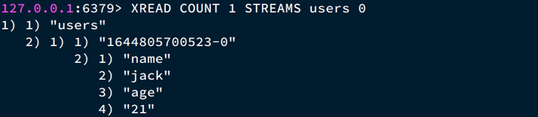 Object msg = redis.execute("XREADGROUP GROUP g1 c1 COUNT 1 STREAMS s1 0");