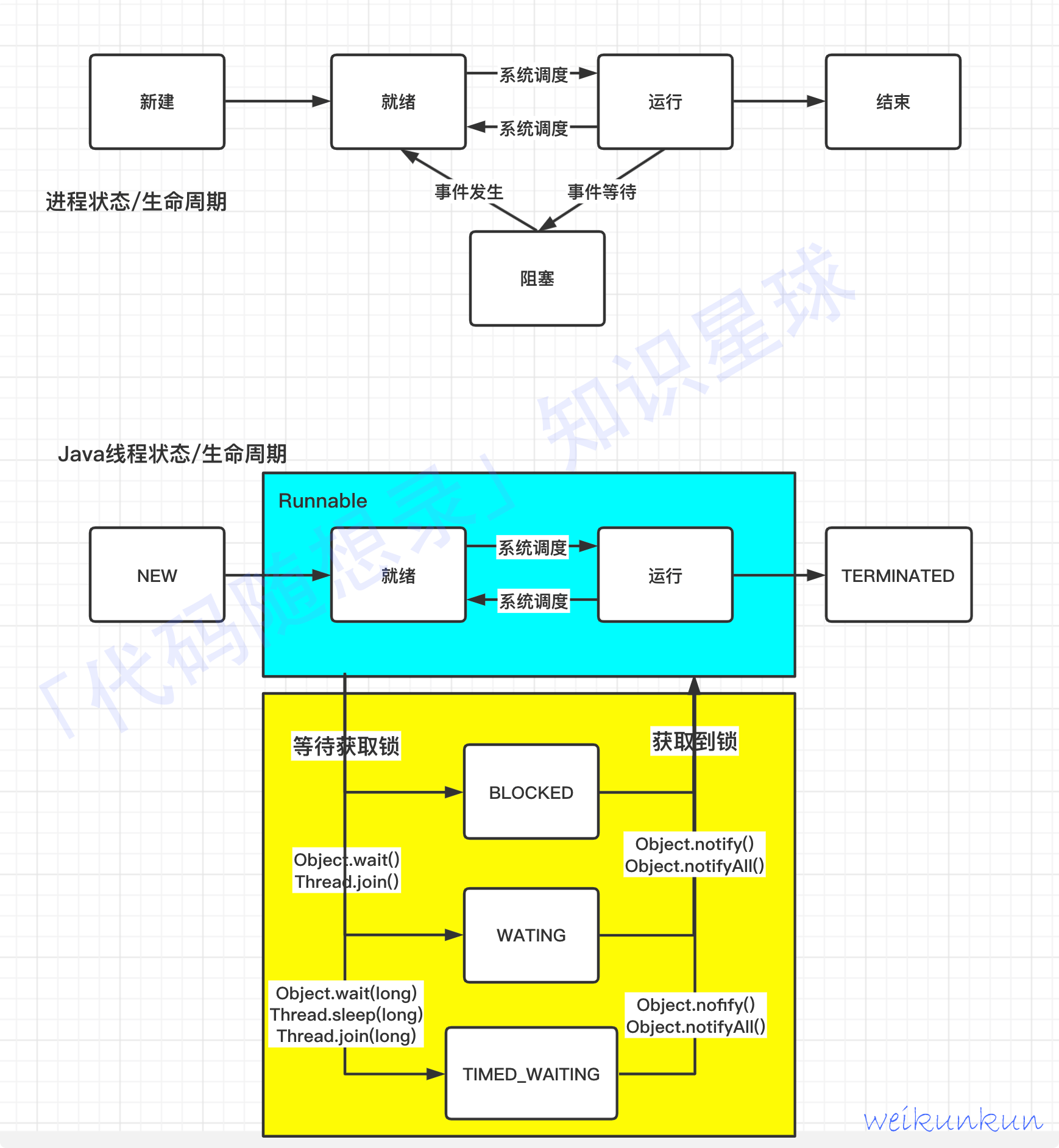 • 线程等待一段时间,当时间到达或者其他条件满足时,线程会重新进入就绪状态。通过Thread.sleep()Object.wait(timeout)Thread.join(timeout)LockSupport.parkNanos()等方式可进入超时等待状态。