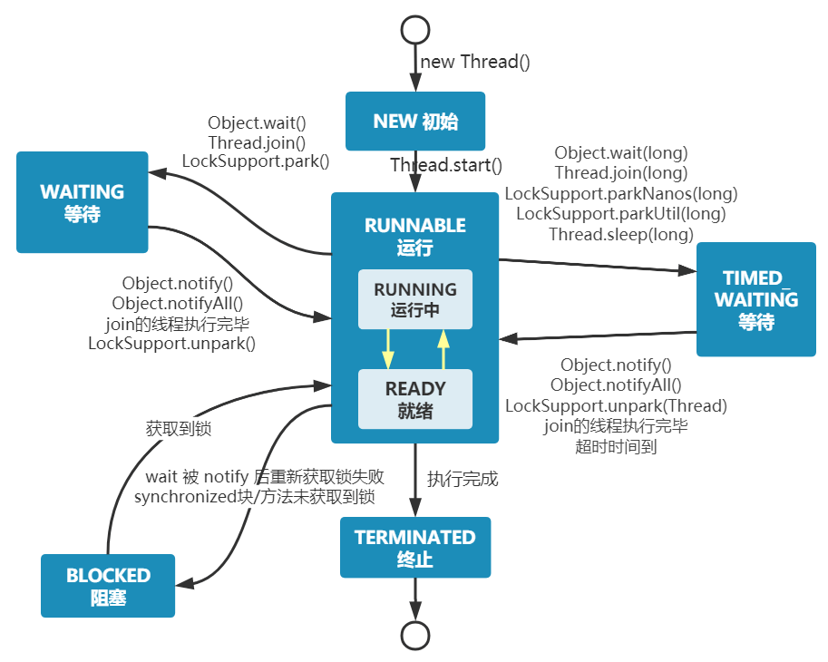 • 注意:在操作系统层面线程有ReadyRunning两个状态,在JVM层面,只能看到Runnable状态,这是因为现在的操作系统基本上都是使用“时间分片”方式进行抢占式轮转调度,而时间分片通常都很小,线程切换太快,区分这两种状态就没意义了