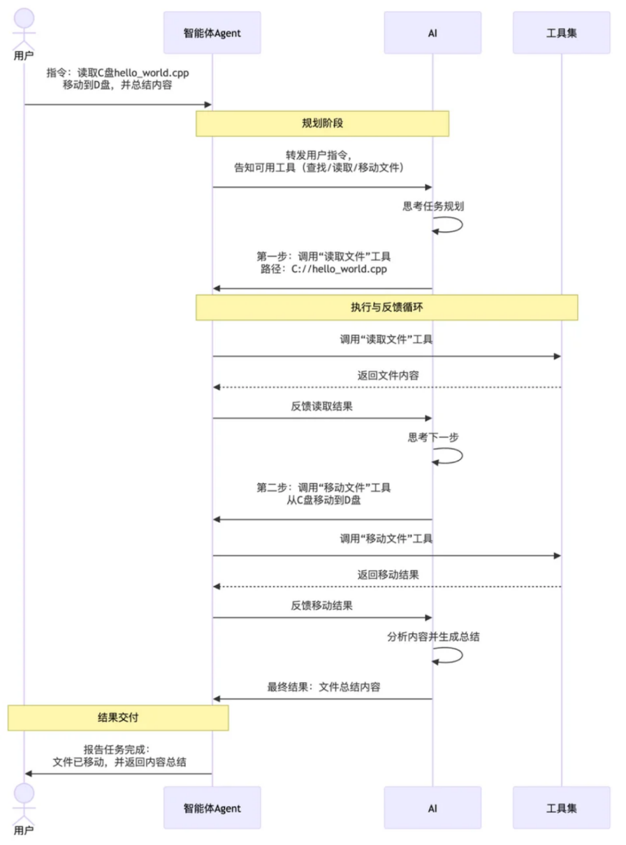 - 智能体agent收到指示后,就实际操作工具移动文件,然后把移动结果反馈给 AI。