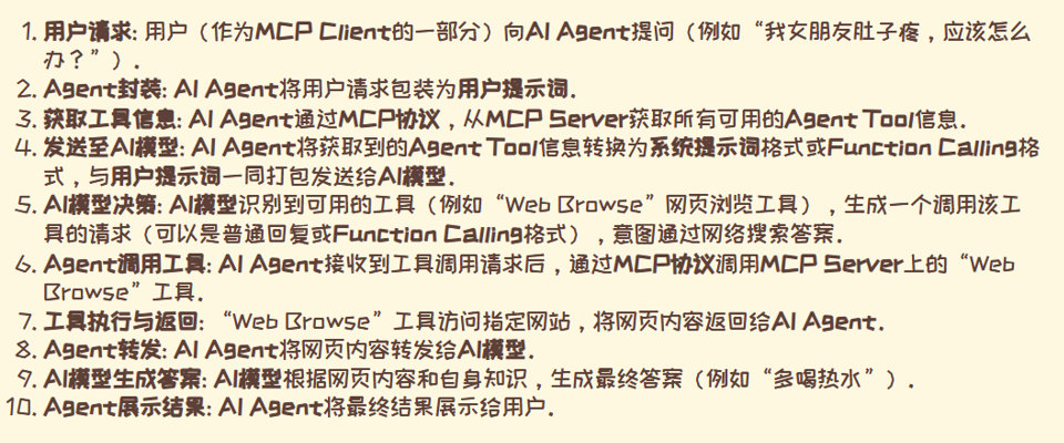 - 智能体agent会先把这个请求传给 AI ,并附带告诉 AI 它可以使用哪些工具,工具有哪些作用。