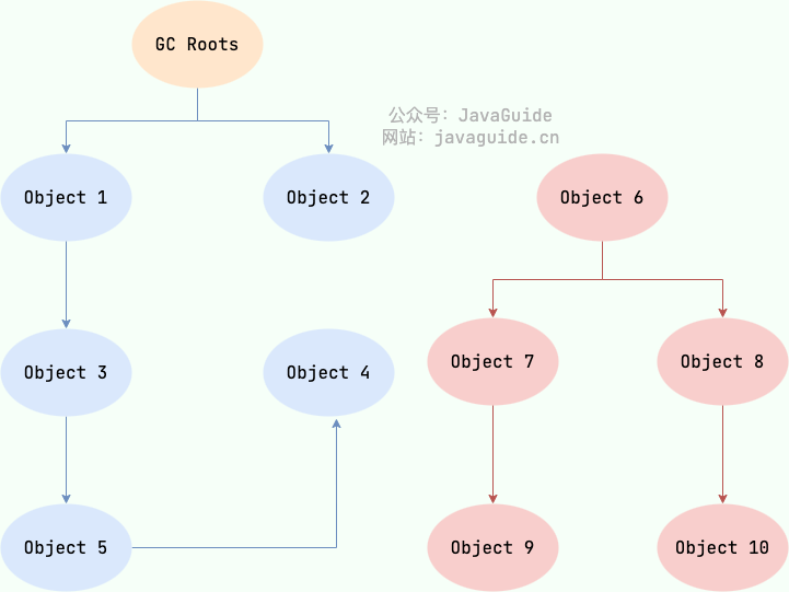 如下图中:Object6 ~ Object10之间虽然有引用关系,但是它们到GC Roots不可达,因此需要被回收。